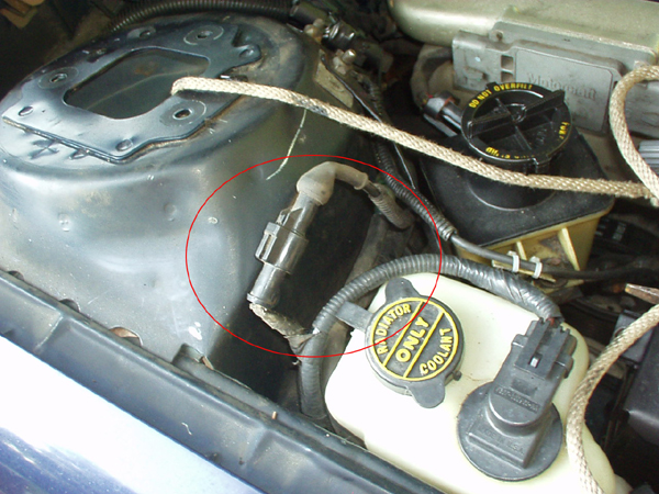 | Connector Location Find this behind the radiator overflow tank and the strut tower. Be sure to put some di-electric compound on the female half of the connector before closing. |