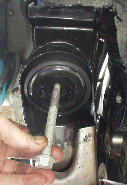 | Rear SFB This bushing was showing some wear, but nothing indicated the extent of the failure that was apparant after removal. Missing pieces of steel were adhered to the sub frame and required light chiseling to remove. Again, the bolt was in good condition |
