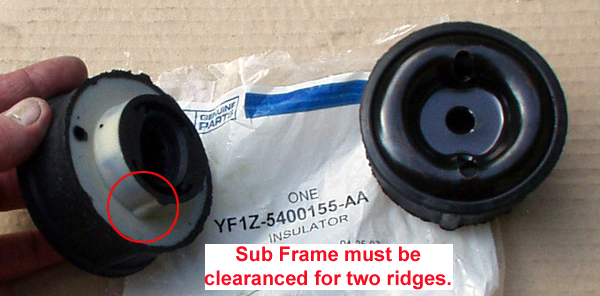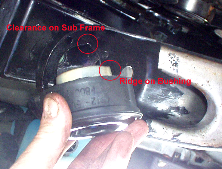 | Notes: This same new bushing assembly is used at all four positions. The kit from RCM - #RCM-921SFB includes four tops and four bottoms I ordered and installed new bolts from RCM. A set of four is part #RCM-922 The Sub Frame Recall had already been performed on this vehicle 70k miles earlier. |