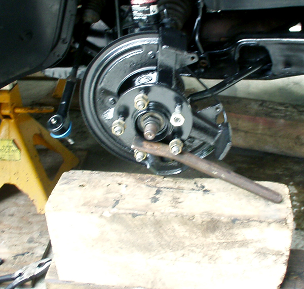 | Installation Tips: Use a pry bar of some sort to brace the wheel lugs when tightening or loosening the hub nut. There are a bunch of ways to work this out. I'm showing one example here. You cana even brace the bar against the caliper seats on the knuckle if you want. I suggest using lug nuts to protect the threads when doing this. When installing the LCA ball joint stud into the knuckle, align the stud and hole as best you can and push them together. Don't be afraid to use a jack with a wood block to help things along. Once the stud is far enough into the knuckle to allow the pinch bolt to be inserted, you are aligned properly. Install the tie rod end into the knuckle, then go back to the nuts at the strut tower and begin to tighten everything to proper specs. I chose NAPA tie rod end #269-2667 (same for both sides). Install the splash shield and sway bar end link last. I chose the NAPA end link #265-2142 (same for both sides). Don't forget to properly tighten all fasteners |