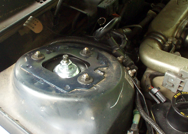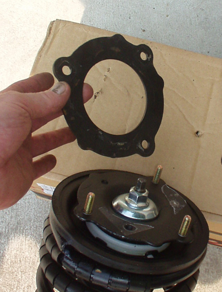 | What To Keep The first item you need to save from the original install is this reinforcement ring. It goes between the bearing/mount and the strut tower. It may even stay stuck in the tower when you remove the old strut. Clean it up, de-rust, paint and put it onto the top of the strut assembly as I am preparing to do. Don't worry about putting it on incorrectly, you can't. |