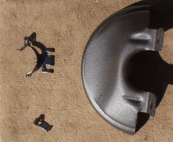 The next two items you must also save from the original install are at right. The shroud from the base of the spring perch, and the clip to hold the ABS cable. You can see my clip broke. I threw the small section away and modified the rest of the clip to accept a zip-tie to mount it to the strut. I have already cleaned and painted these. |